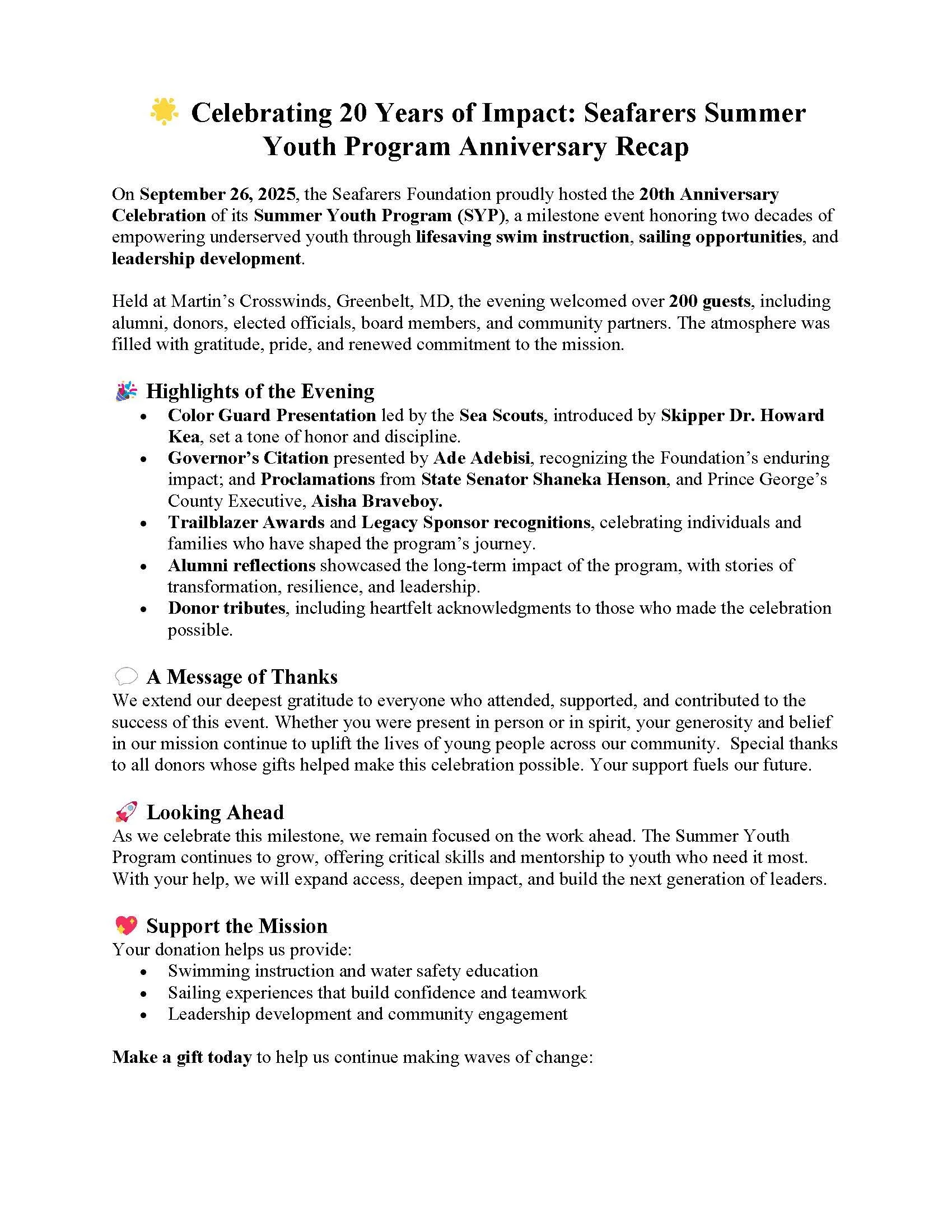 On September 26, 2025, the Seafarers Foundation marked a powerful milestone—our Summer Youth Program’s 20th Anniversary Celebration. Thank you to all who joined us in honoring two decades of youth empowerment through swimming, sailing, and leadership development.